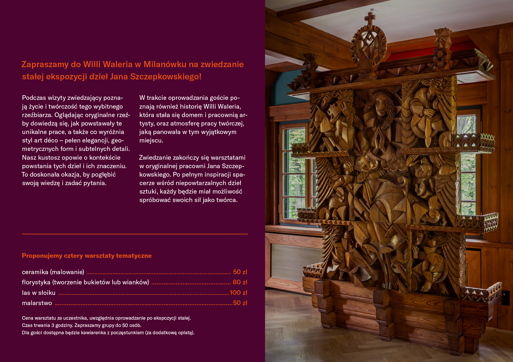 Zwiedzanie może zakończyć się warsztatami w oryginalnej pracowni Jana Szczepkowskiego. To okazja, by – po inspirującym spotkaniu ze sztuką – spróbować własnych sił jako twórca.