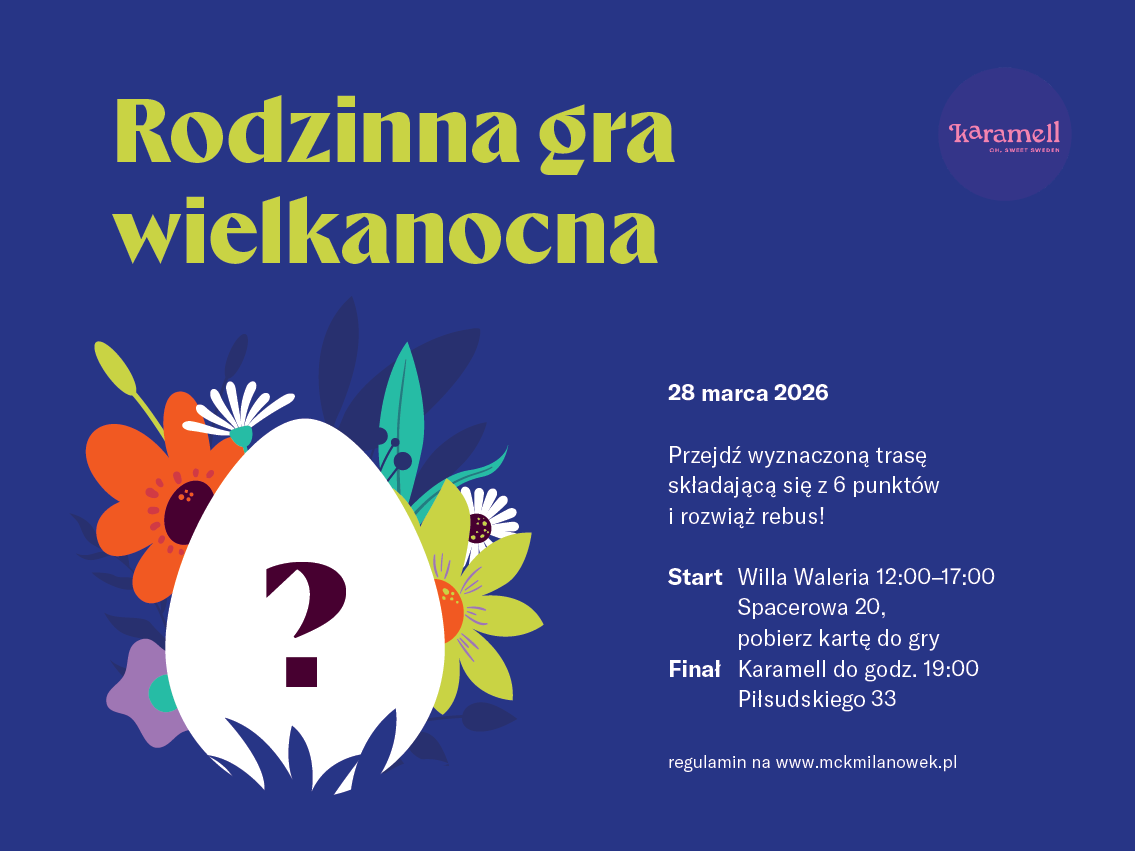 Zapraszamy całe rodziny do udziału w grze wielkanocnej! Wybierz się na spacer po mieście i poszukaj tablic z wielkanocnym jajkiem oraz literą. Z odnalezionych liter ułóż hasło i zdobądź słodką nagrodę. Zaczynamy 28.03 o godz. 12:00 w Willi Waleria Kończymy finałem – słodka nagroda Karamell do godz. 19:00  Przejdź wyznaczoną  trasę składającą się z 6 punktów […]